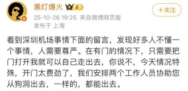 10 月 26 日晚,脱口秀演员黑灯就此事件发表评论,发文称:"看到深圳机场事情下面的留言,发现好多人不懂一个事情,人需要尊严。在有门的情况下,只需要把门打开我就可以自己走出去,你说不,今天情况特殊,开门太费劲了,我们安排两个工作人员协助您从狗洞出去,一样的,都能出去。 "