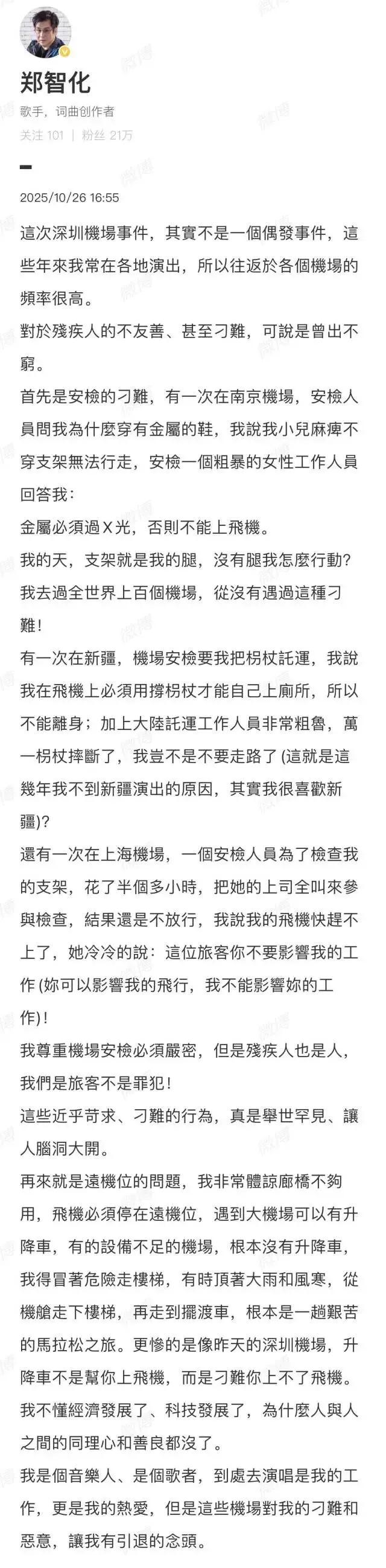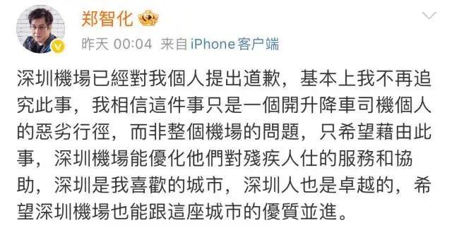 郑智化在微博控诉深圳机场对残疾人"态度最没人性",称升降车与机舱门存在 25 厘米高度差,导致轮椅无法推进机舱,工作人员拒绝调整设备且"冷眼旁观",最终他被迫"连滚带爬"登机。