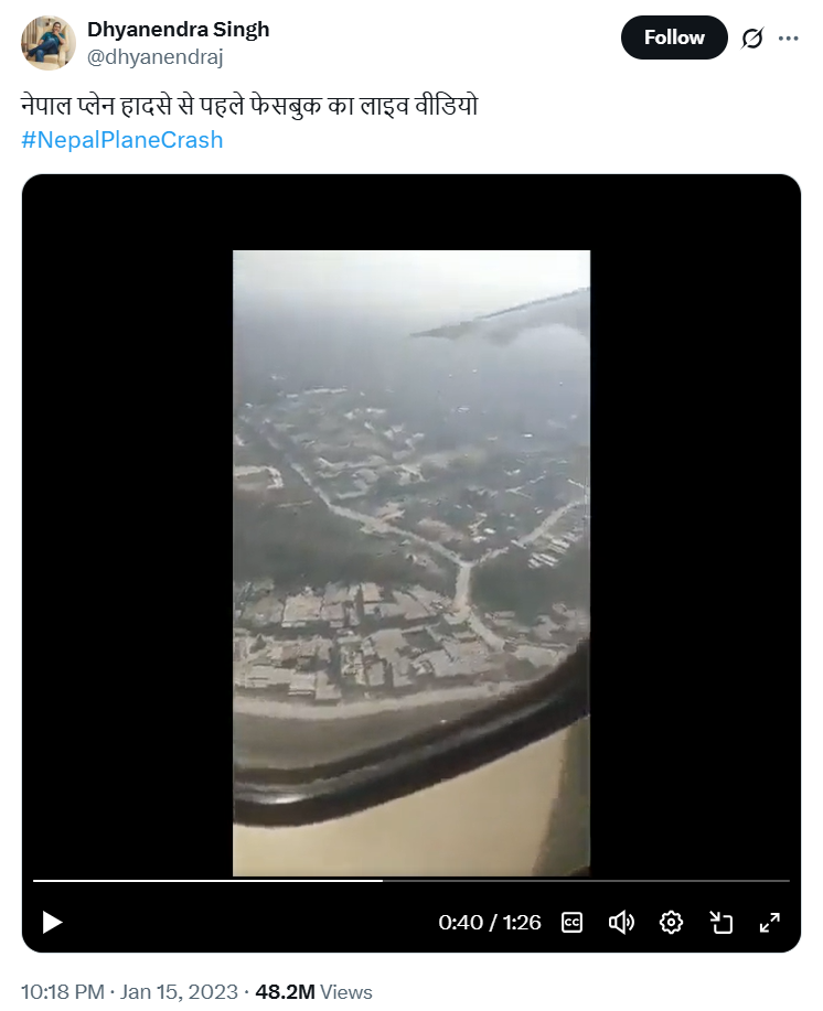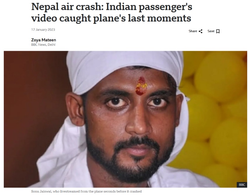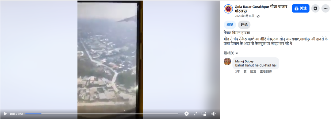 其中,Facebook一则帖文写道:“尼泊尔飞机事故:这是坠机前几秒拍下的视频。遇难者索努·贾伊斯瓦尔(Sonu Jaiswal)来自加济普尔。事发时,他正在飞机内通过 Facebook 进行直播。”