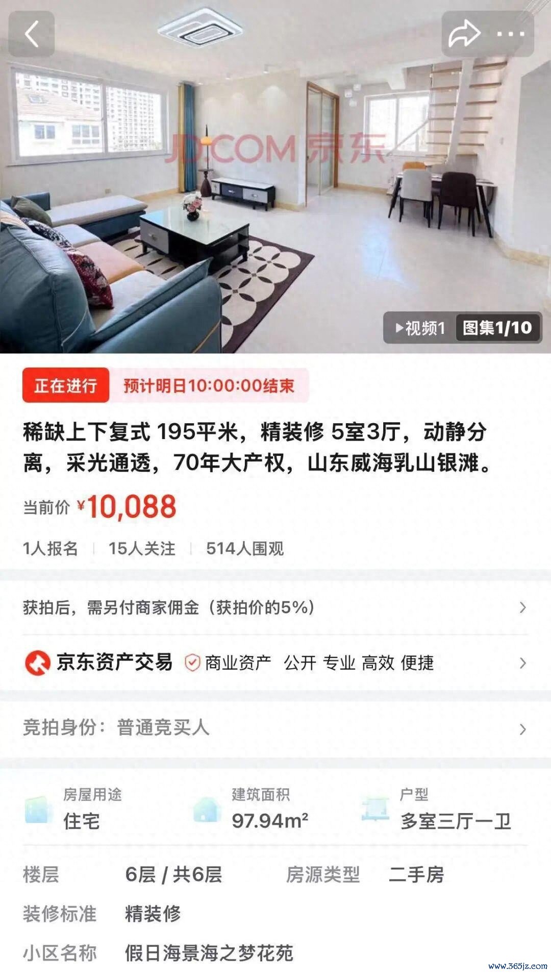 近日,山东乳山银滩的“195平米复式”在京东资产交易平台上掀起一阵热闹。起拍价只要10 088元,保证金2万元,24 小时内已经被加价到 15 688 元,刷新了不少网友的“三观”。这套房子到底是怎样的“白菜价”,为什麼会被如此低的起点吸引大批买家,又隐藏了哪些坑?下面给大家把这件事拆得更明白一点。