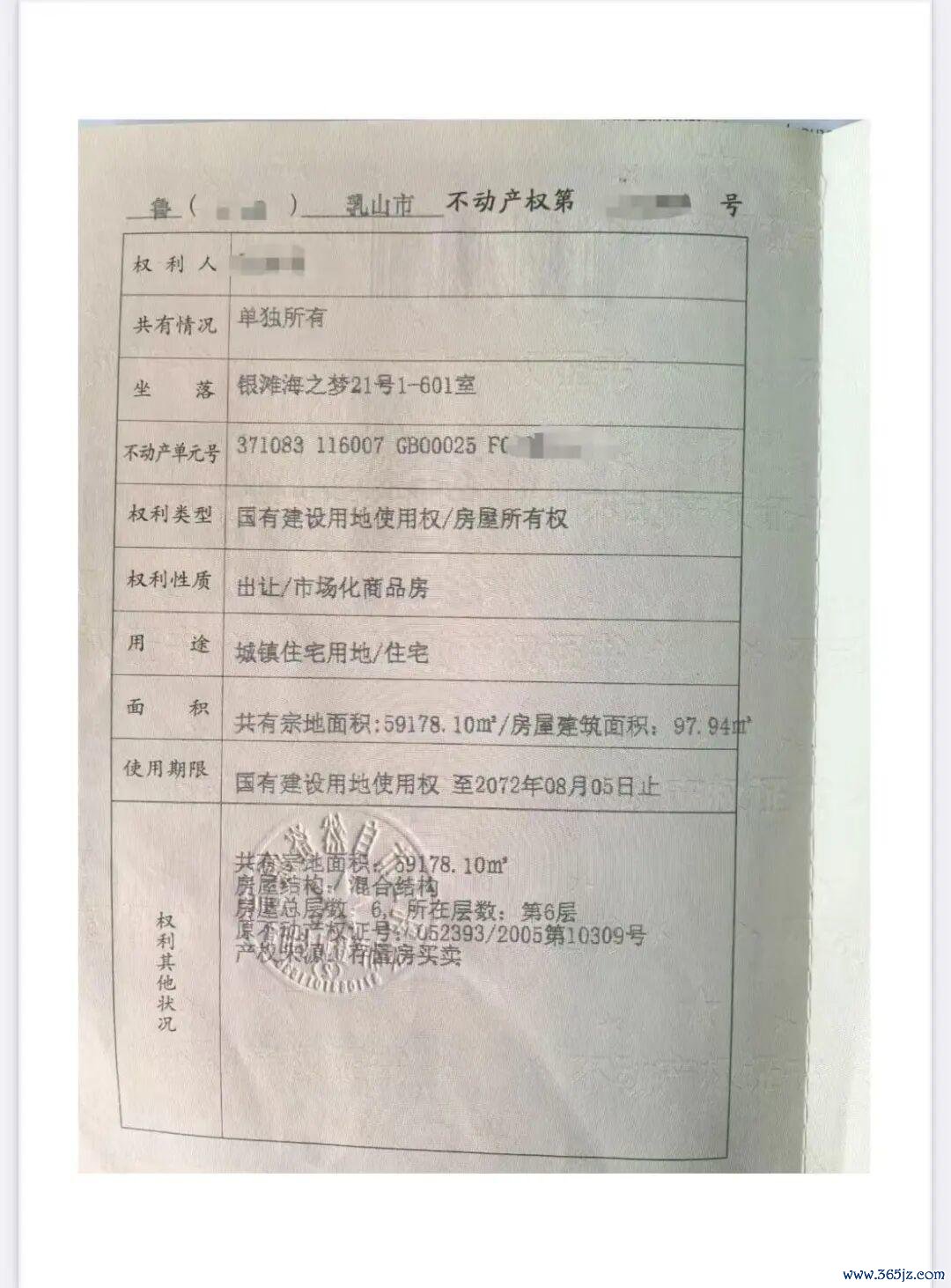 先说位置。房子坐落在威海乳山市的银滩海之梦小区,具体在第6层(总共6层),楼层已经是最高层,视野自然不错。官方登记的建筑面积是 97.94 平方米,属于国有建设用地使用权/房屋所有权,出让期限到 2072 年,算是标准的 70 年大产权。平台上宣传的“195 平米”并非真正的产权面积,而是把楼层的梯间、平台、露台等公共或赠送空间全部算进去的楼面总面积。简单来说,买家手里真正能依法交易的只有那 98 平方米,而另外约 97 平方米是“赠送面积”,在买卖、贷款、抵押时都不会计入评估价值。